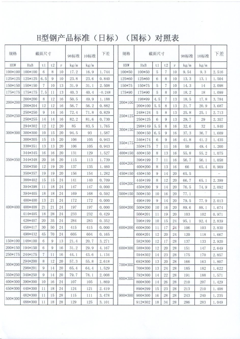 Q355DH型鋼產品標準(日標)(國標)對照表